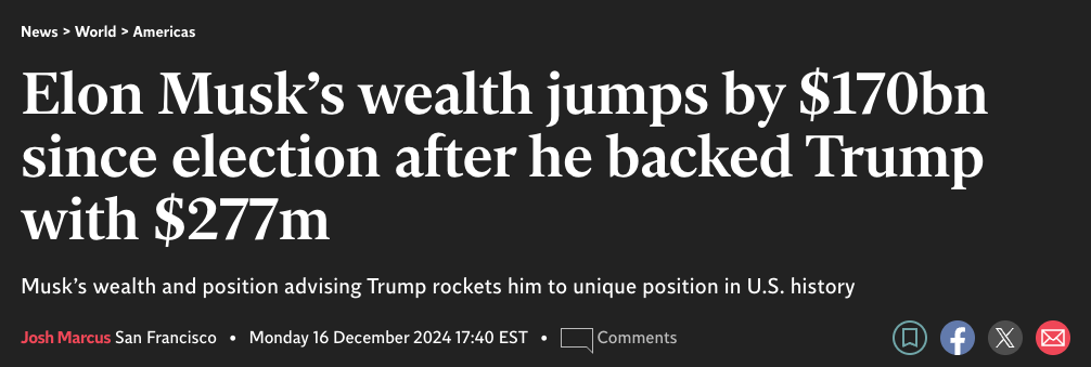 Elon has made billions from a $277m investment in Trump’s campaign.