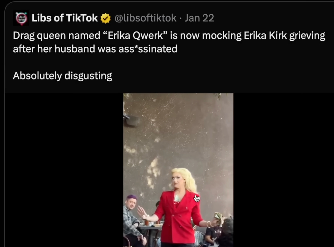 Right wing accounts on Twitter are already freaking out. Libs of TikTok posted about a drag queen named “Erika Qwerk” who is mocking her. And honestly that is a fire drag name.