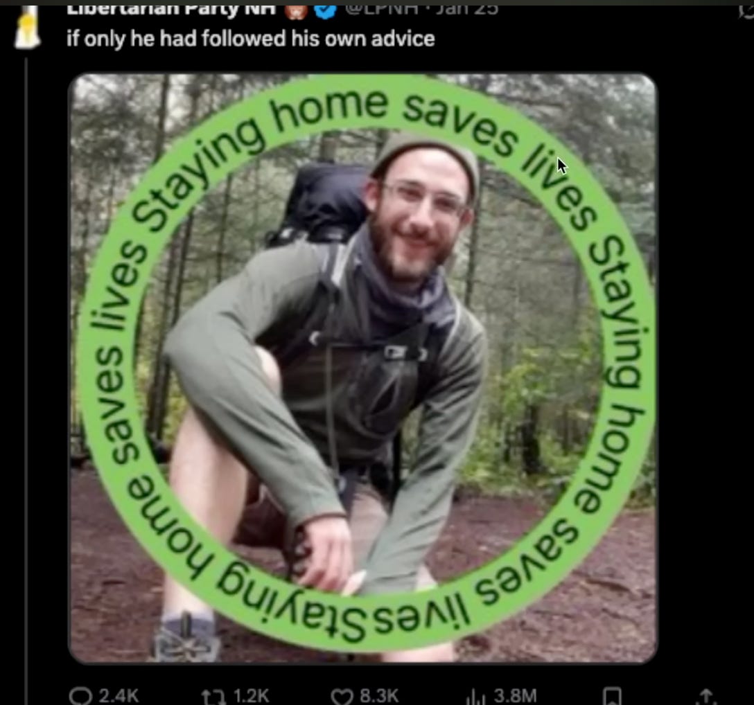 The Libertarian Party posted a disgusting attack on Alex Prey, the nurse executed by federal agents. They dug up a photo he took during COVID saying “staying home saves lives.”