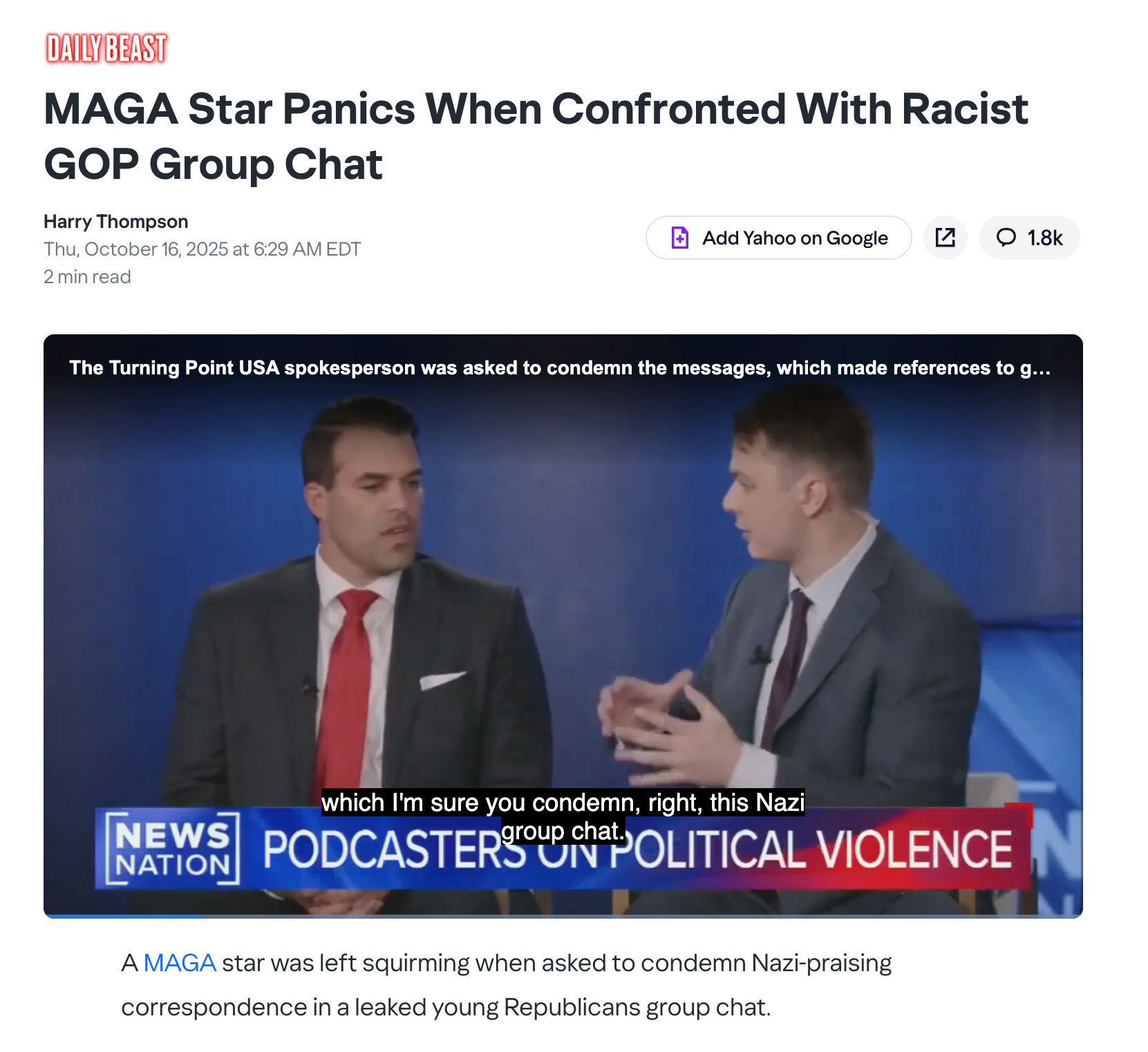 You may have seen me in the news couple months ago at the Kennedy center when I asked a Turning Point USA leader to condemn the “Young” Republican Nazi group chat. Sadly, he decided to embarrass himself on stage after being confronted with the softest of softball questions.