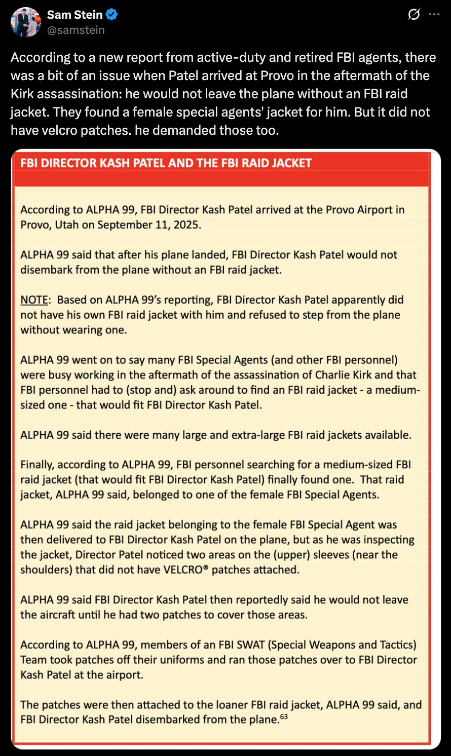 Then we get to the tantrum. The one that tells you everything you need to know about who he is. According to the agents involved, Patel refused to step off the plane after the Kirk assassination unless he had an FBI raid jacket. They scrambled to find one. None of the large or extra large jackets would fit him, so they had to take a medium from a female special agent. And once he finally had it, he still refused to get off the plane because two of the Velcro sleeve patches were missing. So SWAT agents stopped their work, removed their own patches, and ran them to the director so he could pose for cameras