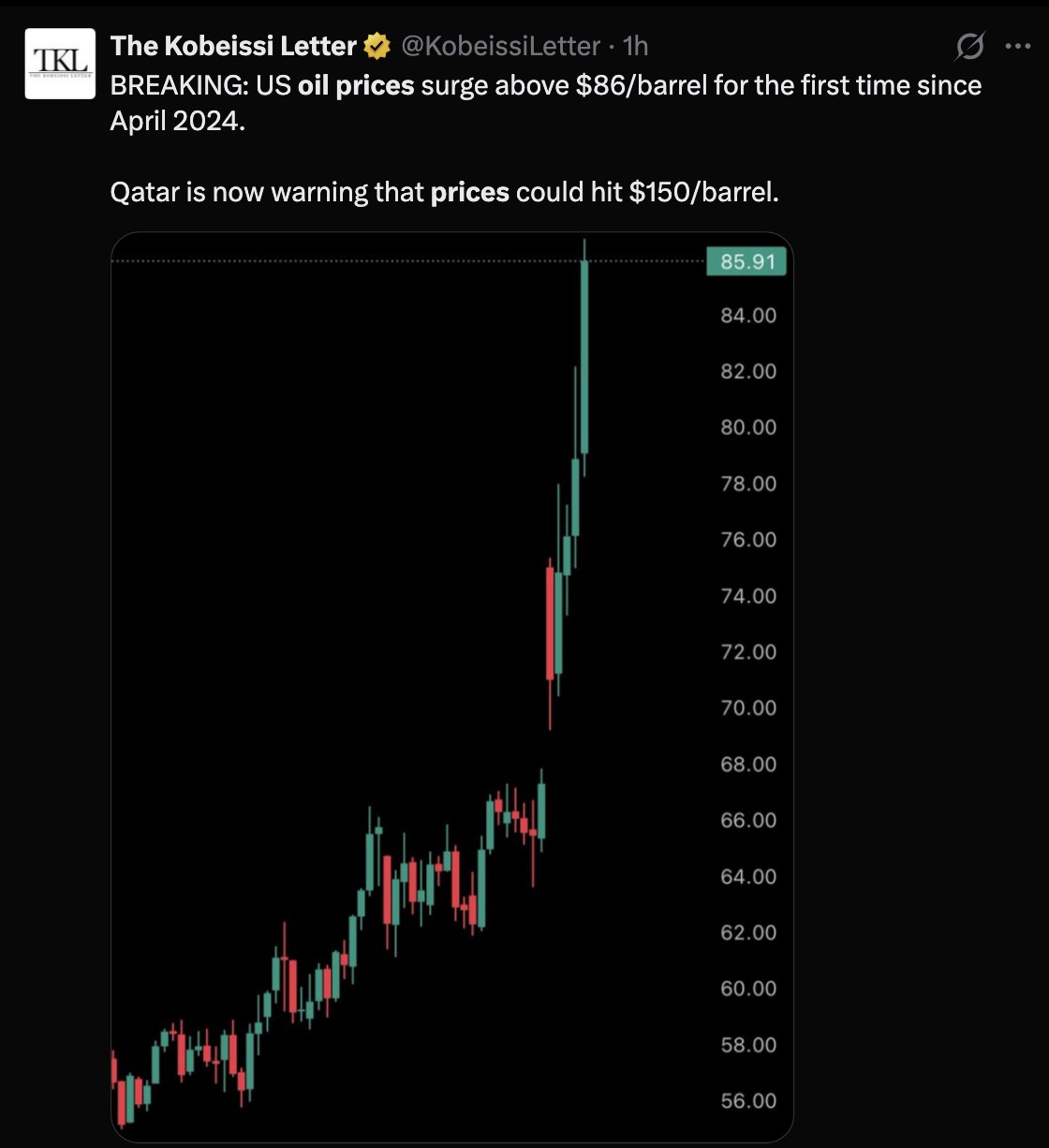 After the escalation between the United States, Israel, and Iran, oil markets began reacting almost immediately. Prices surged to $86 per barrel, the highest level since April 2024. Qatar is already warning prices could spike as high as $150 per barrel if the situation worsens.