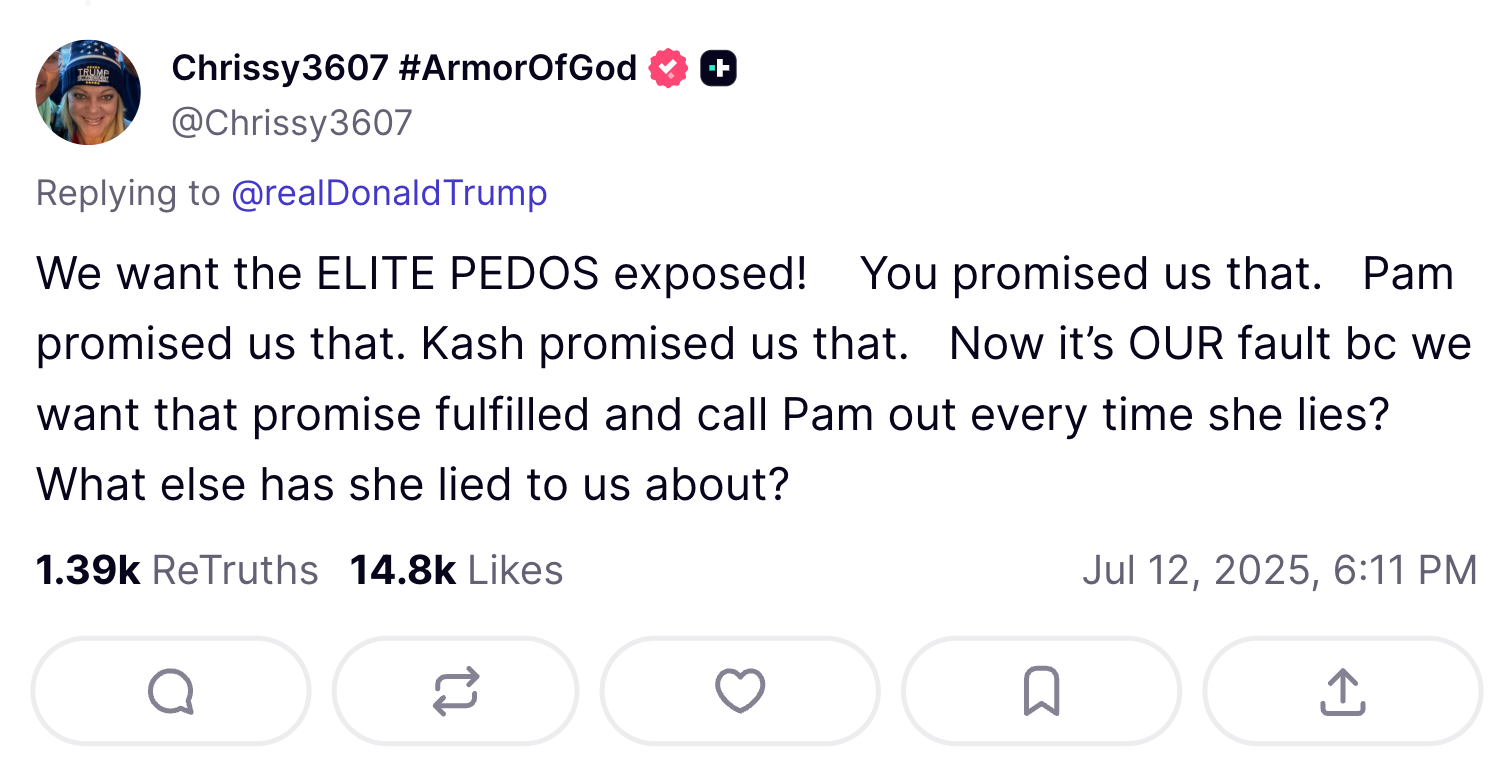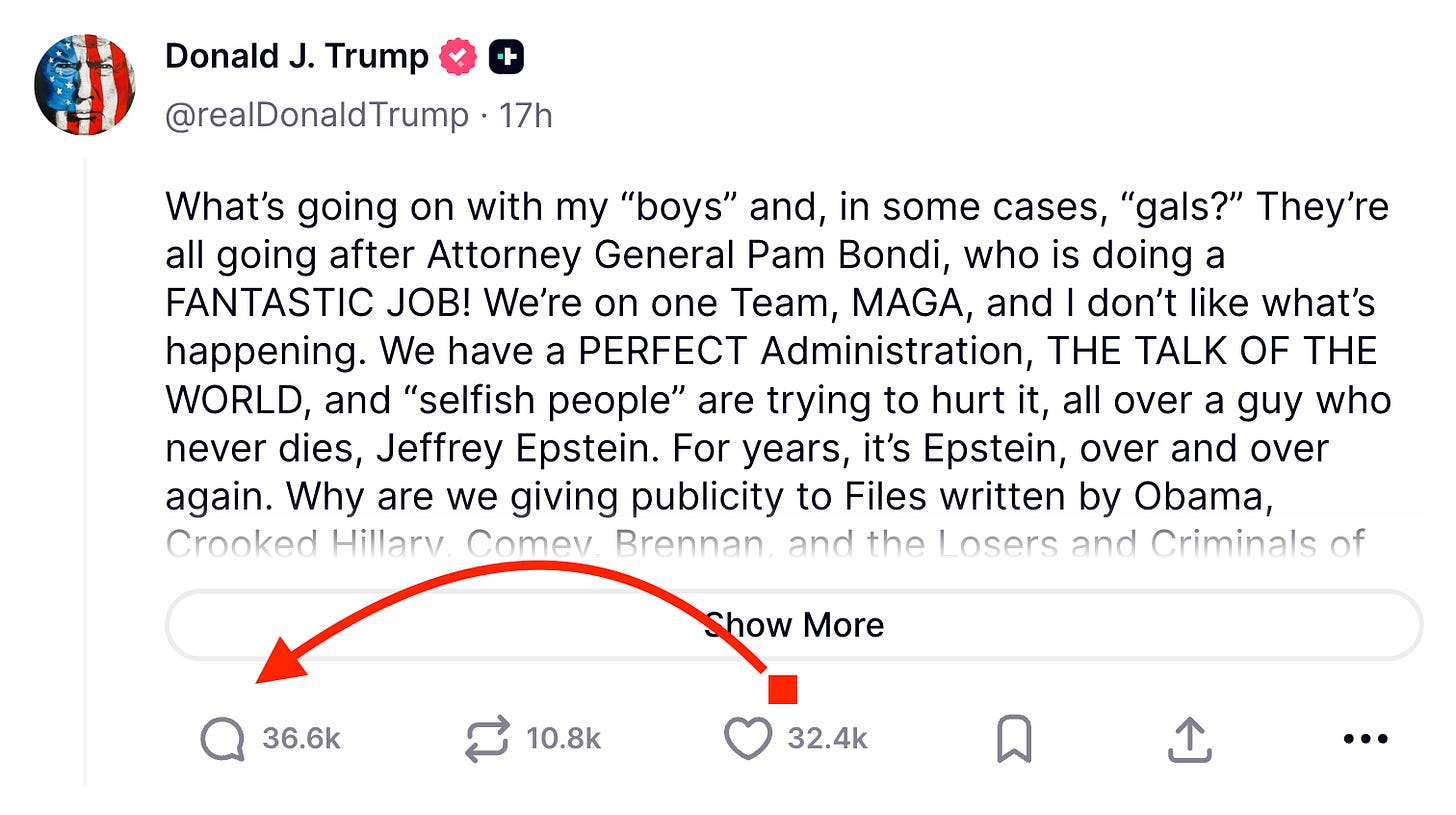 The reason he is panicking is simple. His own supporters are demanding answers. It’s so bad on Truth Social that his post was ratioed (when a post gets more replies than likes, and trust us, the replies were not happy with him).