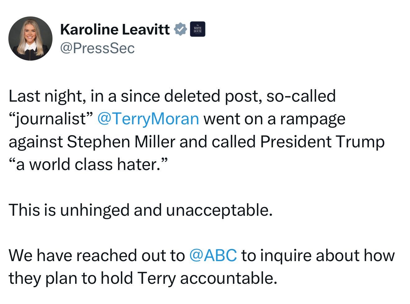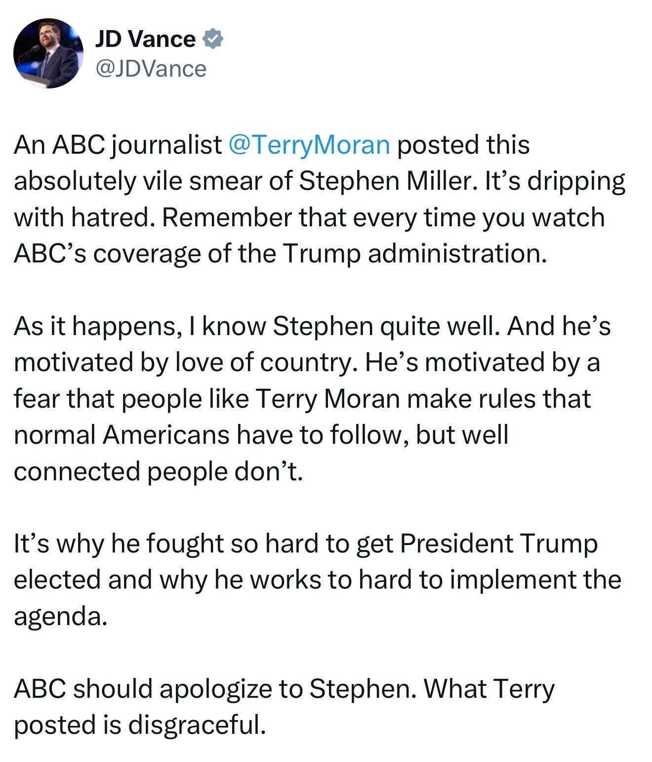 Vice President J.D. Vance followed with a statement calling Moran’s post “an absolutely vile smear of Stephen Miller” and demanded an apology from ABC News.