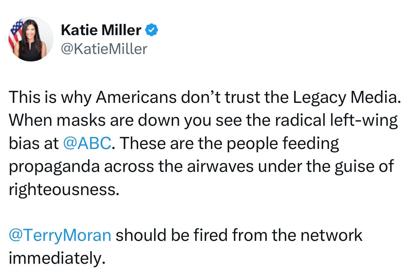 Katie Miller—Stephen Miller’s wife and a former White House aide—went further, calling for Moran’s termination.