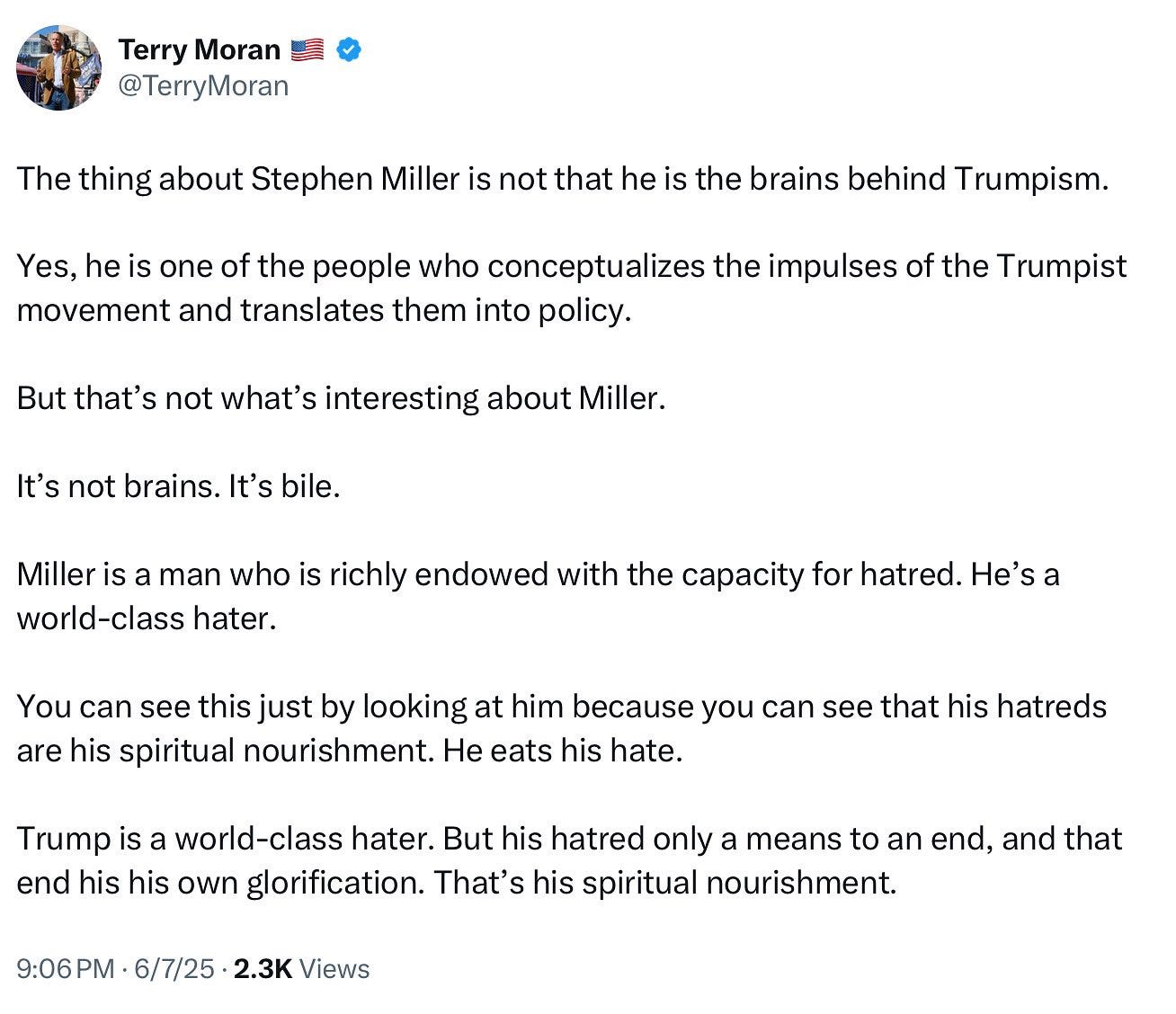 At 12:06 a.m. on Saturday, longtime ABC News correspondent Terry Moran posted a tweet describing White House Deputy Chief of Staff Stephen Miller as “a world-class hater” whose “hatreds are his spiritual nourishment.”. No profanity. No false claims. Just a harsh but fact-based read on one of the most powerful figures in the Trump administration.