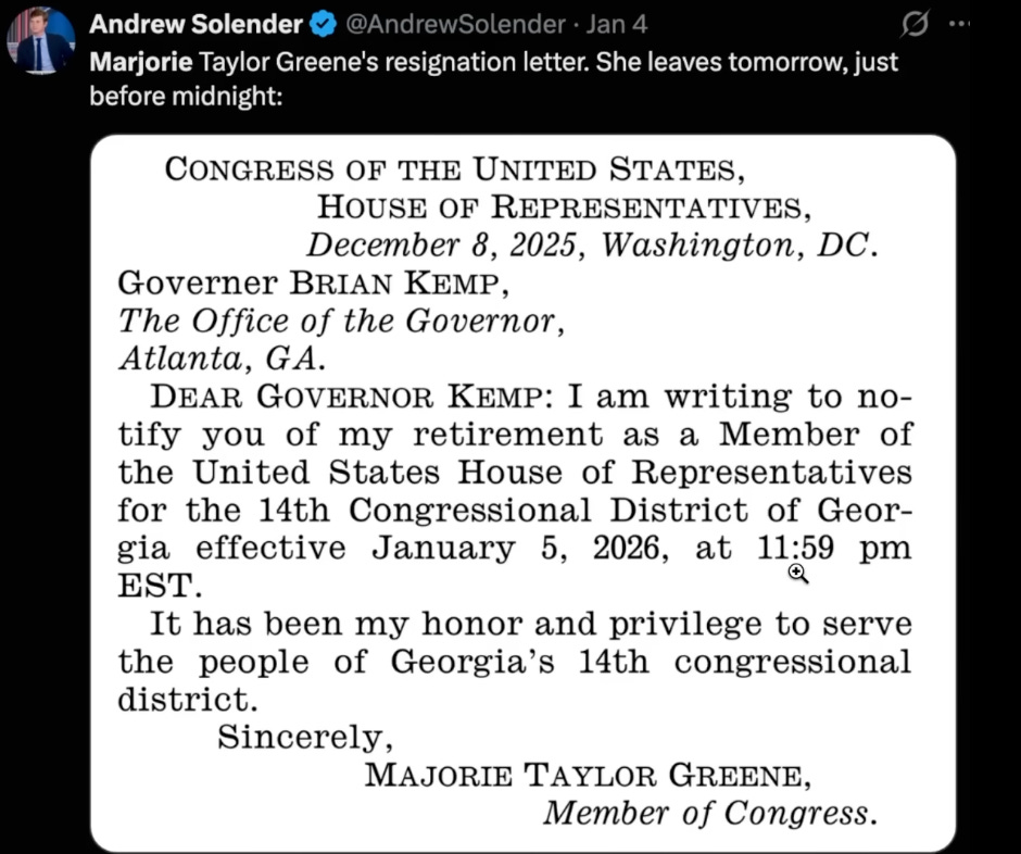 Marjorie Taylor Greene quietly submitted her resignation, effective January 5 at 11:59 p.m. As of right now, Republicans are sitting at 218 seats to Democrats’ 213.