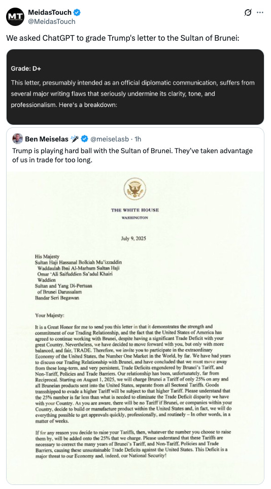 He claimed his tariffs were based on “common sense,” which is another way of saying he just winged it. His “common sense” strategy included a letter so poorly written that ChatGPT grade it as a D+.
