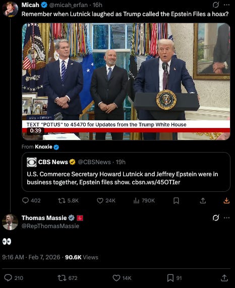 Zero credit to Howard Lutnick. Zero credit to Donald Trump who has fought tooth and nail to hide these files because of his involvement within them. The same administration that lies about everything from the economy to health care is now trying to say Lutnick “didn’t know” who he was doing business with.