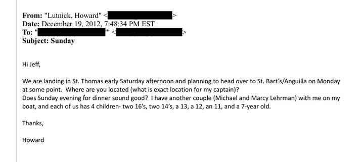 It gets worse. Emails show they arranged calls and planned to have drinks in 2011. Lutnick was invited for lunch on December 24, 2012. Later, Epstein’s assistant wrote to Lutnick on behalf of Epstein saying it was nice seeing him.
